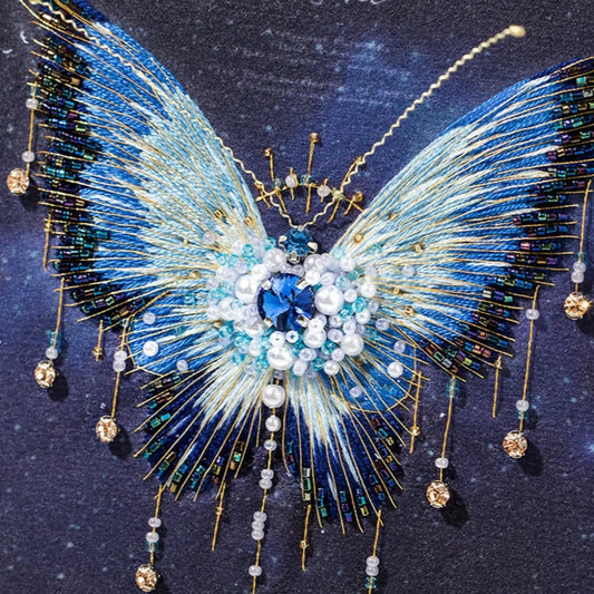 Psyche Blue Butterfly — Hand-Embroidered Framed Art