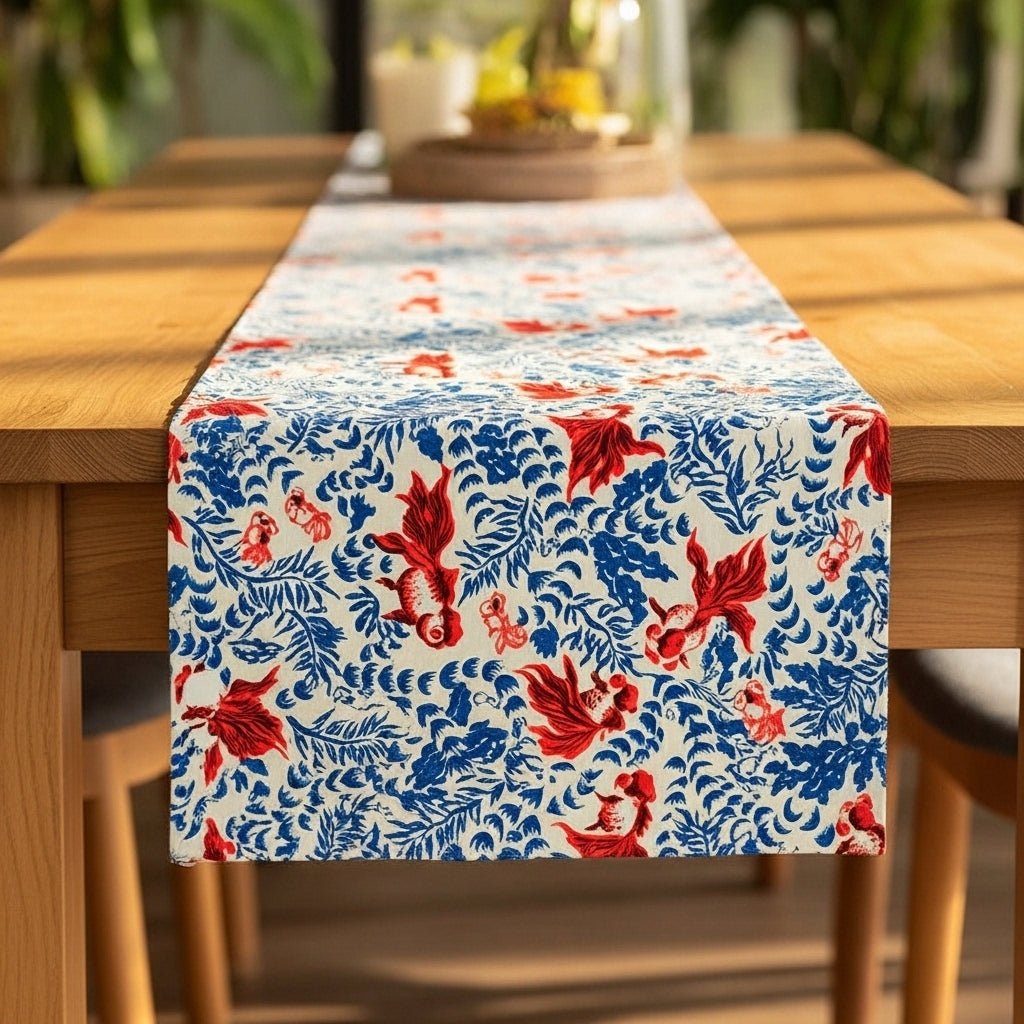 Crimson Goldfish Toile — Hand-Printed Cotton Runner